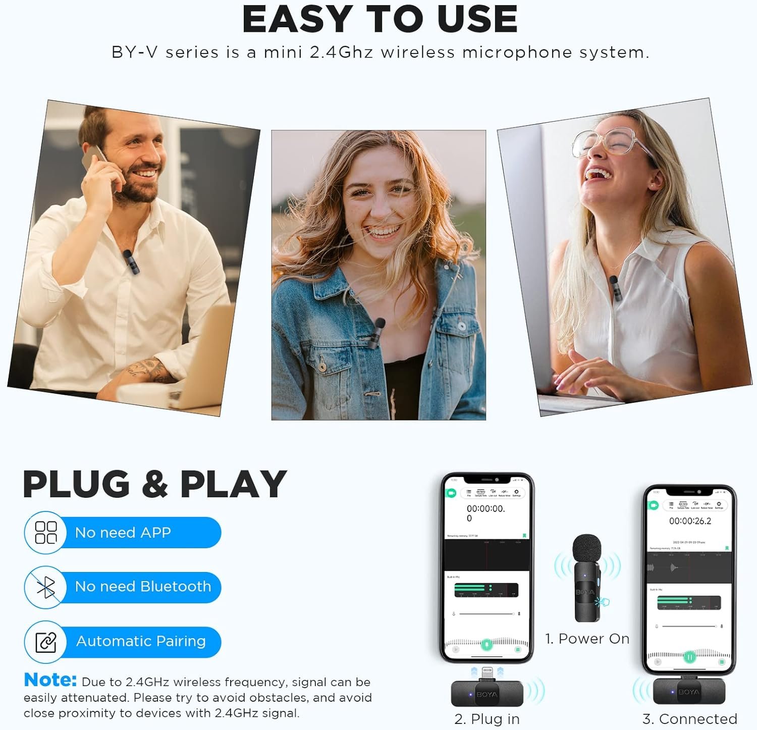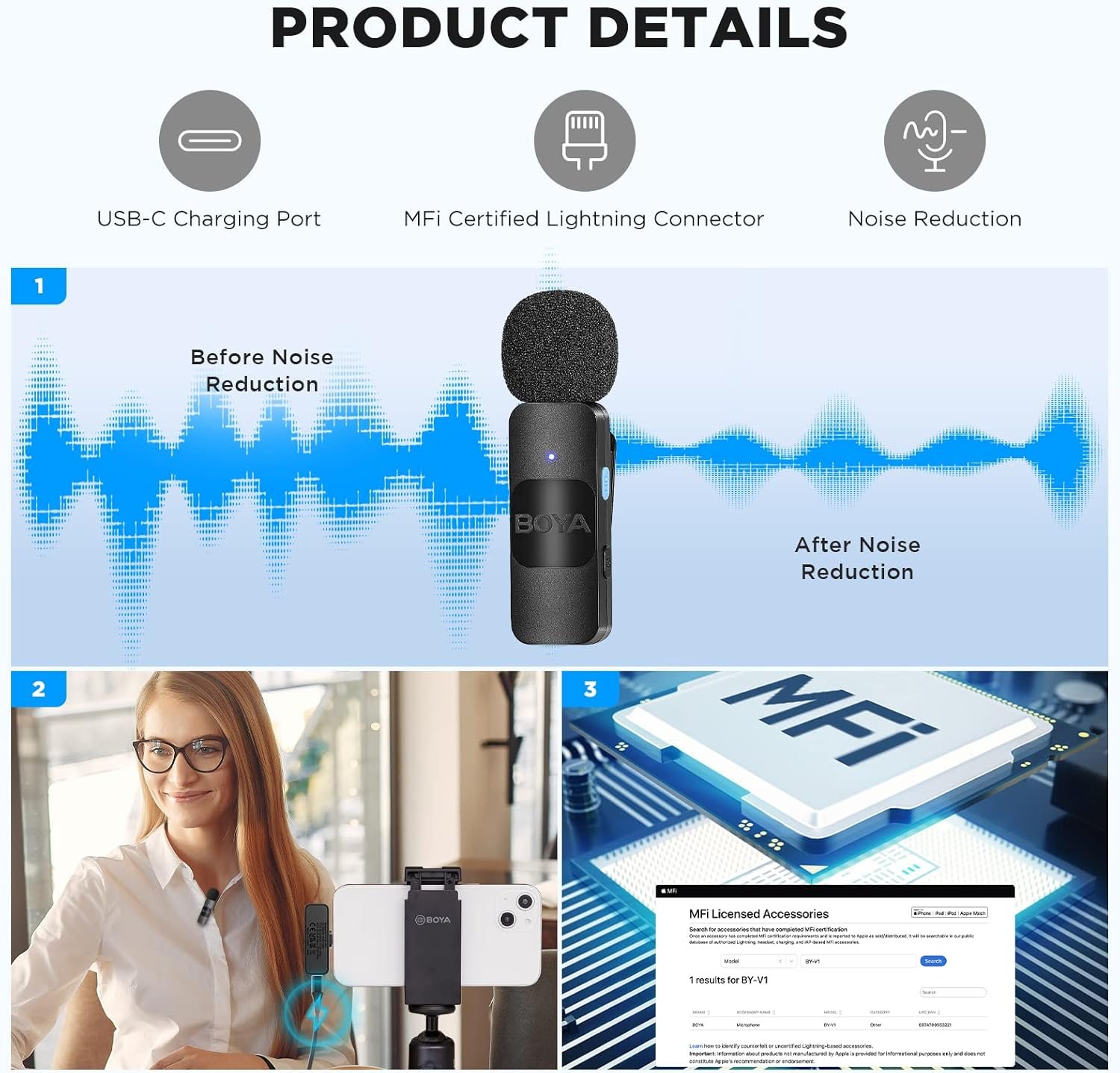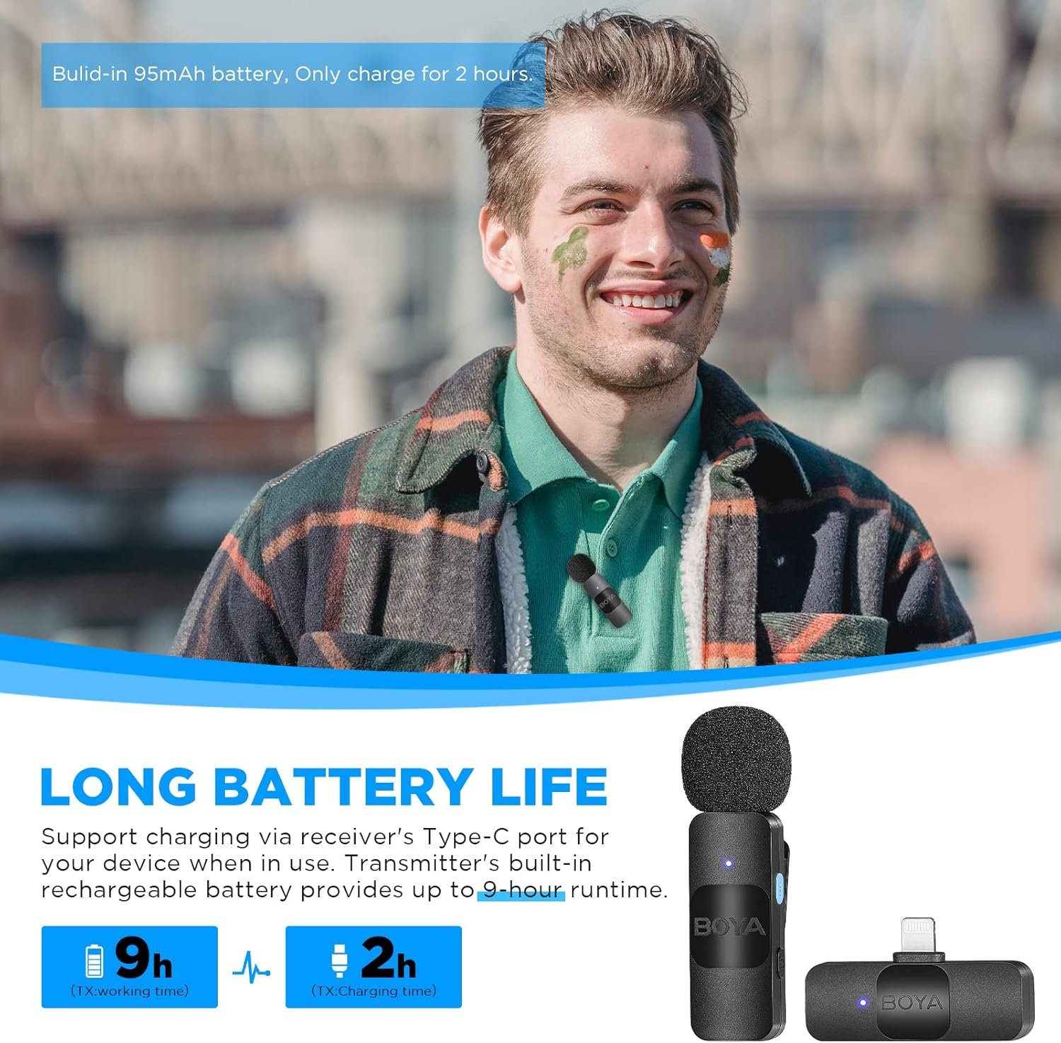 Easy Automatic Connection: This innovative wireless lav microphone is much easier to set. No Adapter, Bluetooth or Application needed. Just plug the receiver into your devices, then turn on the portable mic, these two parts will pair automatically Omnidirectional Sound Reception: Equipped with High Density Spray-proof Sponge and High-sensitivity Microphone, our device clearly records every detail of the sound regardless of surrounded environment. Our Noise Reduction Technology cuts off any noise interference while recording so as to ensure the sound quality MFi Certified: The upgraded wireless clip-on microphone is equipped with a Lighting connector and a charging Cable. Compatible with iOS smartphones, iPad, etc, the handheld mic is suitable for interviewing, online conferencing, podcasting, vlogging, live streaming Universal Wireless System: The small lapel microphone is free of wire. You can hold it by hand or clip it on your shirt. Enable to cover 164ft for signal, helps you get rid of messy wire and clearly recording or taking video at a further distance indoors or outdoors Rechargeable Transmitter and Receiver: The wireless lavalier microphone is built in 95mAH rechargeable batteries up to 9 hours operation time with only two-hour charging time. While using the lav mic, you can charge your device simultaneously