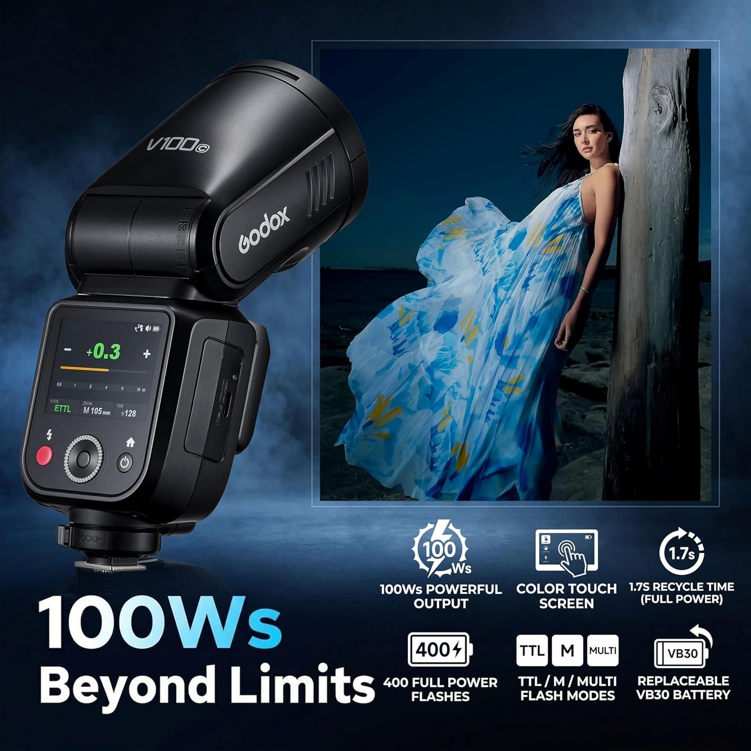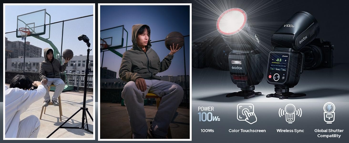 100Ws Godox flash, 70 Full-Power:As an upgraded version of GODOX V1 for Canon and GODOX V1 PRO, The GODOX V100 sets a new benchmark for on-camera flashes by offering an unprecedented 100Ws power at its maximum output(M mode). With adjustable power steps from 1/1 to 1/256 or from 2.0 to 10. Thanks to its advanced cooling system, the GODOX V100 delivers 70 to 100 consecutive flashes at 100Ws without compromising performance.