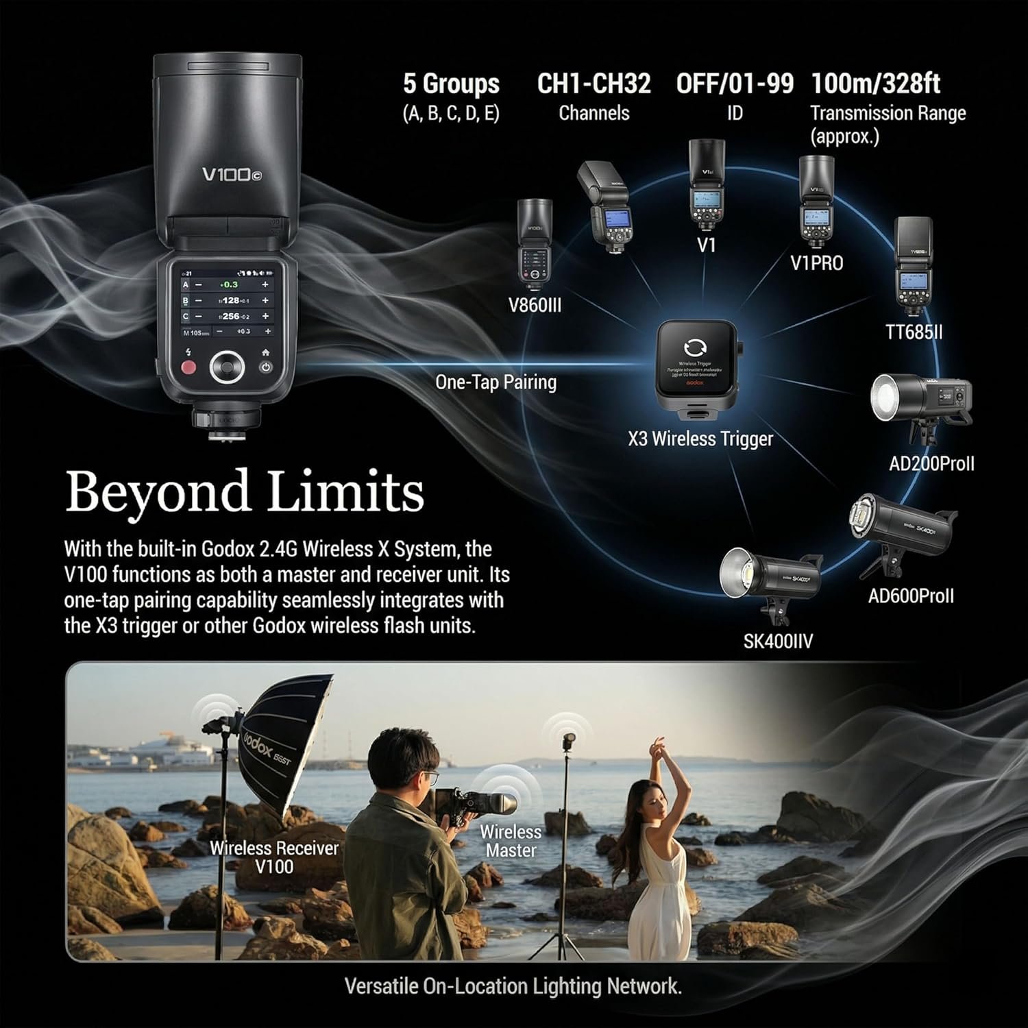 Built-in 2.4G Wireless &LED Modeling Lamp: With the built-in Godox 2.4G Wireless X System, the The GODOX V100 for Canon functions as both a master and receiver unit. Its one-tap pairing capability seamlessly integrates with the GODOX X3 trigger or other Godox TRIGGER or wireless flash units. A 2W LED modeling lamp with 10 adjustable levels provides flexible options for previewing light effects or serving as a fill light