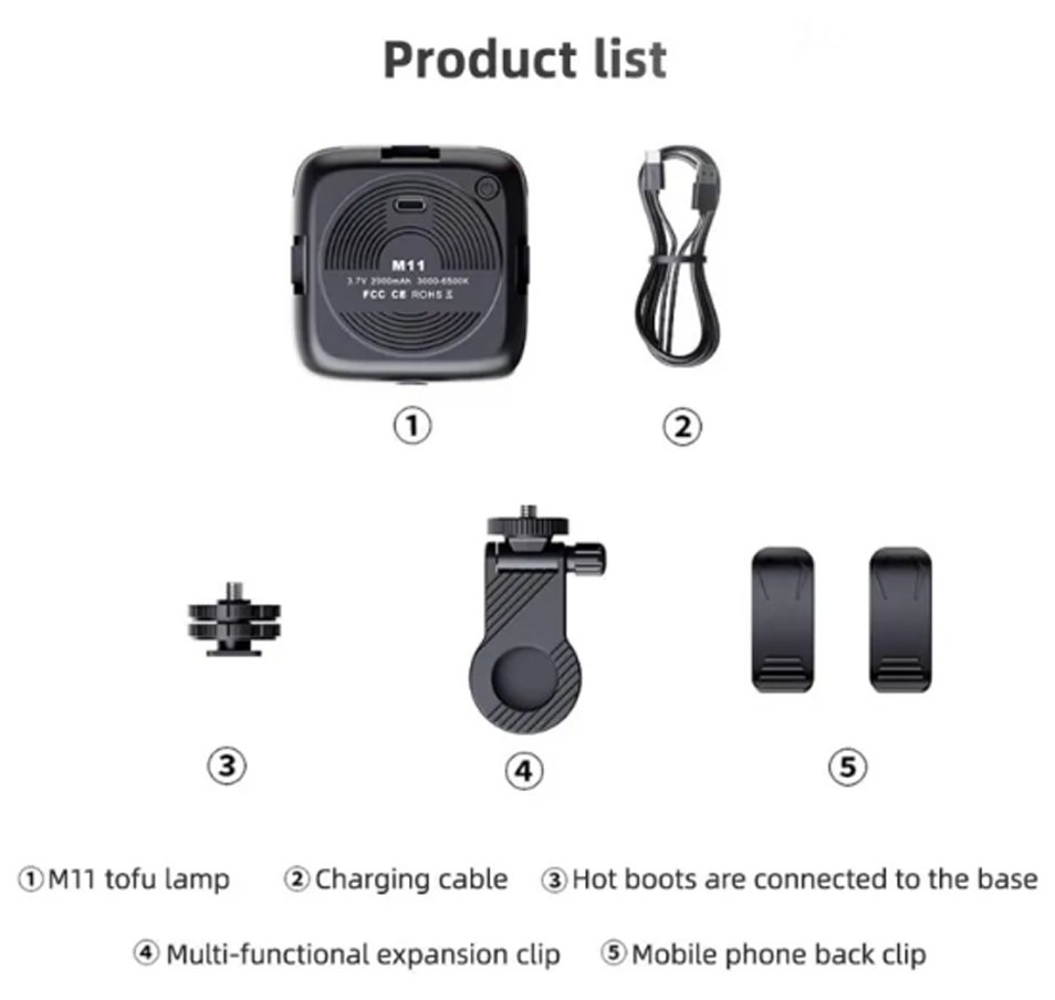 ” 1 . White, warm, warm white 2 . Ra90 3. Color temperature: 3000-9900K 4. Thin and light size, easy to carry 5. Build in 2000mah battery, can used for 8 hours after full charged 6. Charging time: 3hour 7. 120 degree free rotation adjustment 8. Type C charging port 9. Led beads: 32pcs white, 32pcs yellow 10. Power: 4.5W 11. Voltage: 3.7V 12. For phone, computer, camera, notbook “