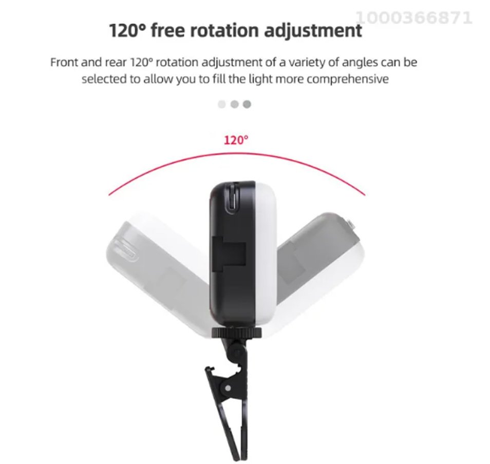 ” 1 . White, warm, rgb 2 . Ra90 3. Color temperature: 3000-9900K 4. Thin and light size, easy to carry 5. Build in 2000mah battery, can used for 8 hours after full charged 6. Charging time: 3hour 7. 120 degree free rotation adjustment 8. Type C charging port 9. Led beads: 32pcs white, 32pcs yellow 10. Power: 4.5W 11. Voltage: 3.7V 12. For phone, computer, camera, notbook”